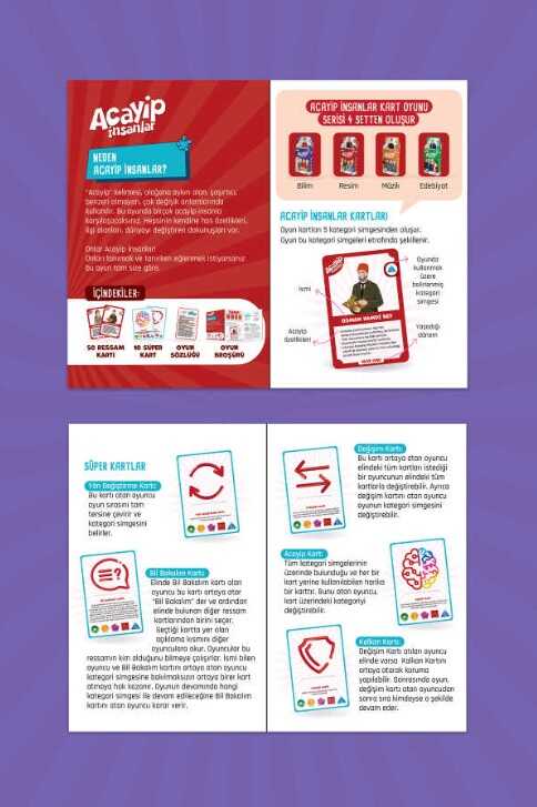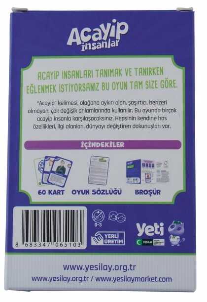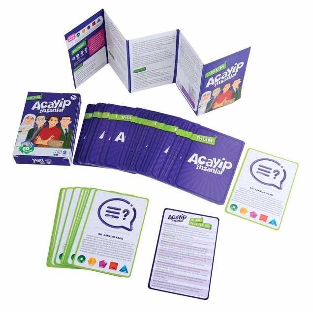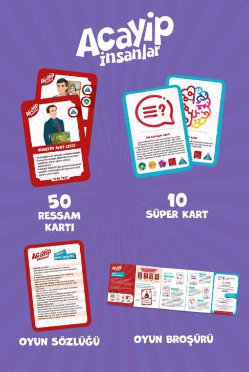ACAYİP İNSANLAR KART OYUNUOyun kurgusunda amaç birçok acayip insanla karşılaşıp, kendilerine has özelliklerini, ilgi alanlarını, dünyayı değiştiren dokunuşlarını öğrenmektir.Alanlarında büyük başarılara imza atmış örnek ve öncü şahsiyetleri çocuklara tanıtmayı hedefleyen, 4 farklı temada hazırlanan kart oyunu serisidir.•Bilim•Müzik•Edebiyat•Resim