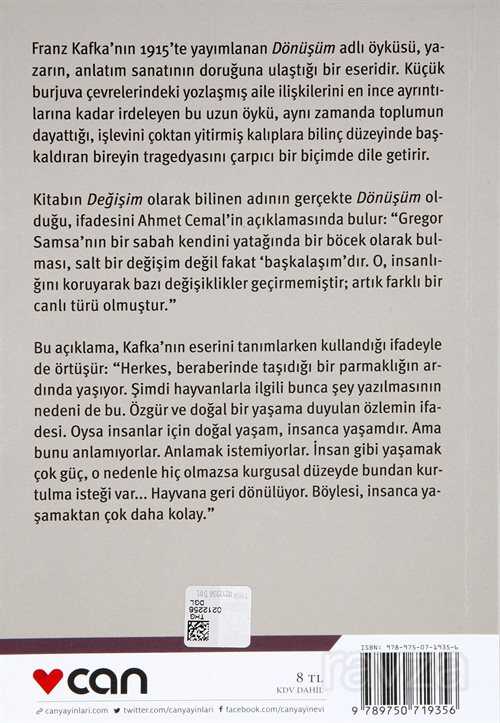 Kafkanın 1915 yılında yayımlanan Dönüşüm adlı anlatısı yazarın anlatım sanatının gerçek anlamda doruklarına varmış olduğu bir yapıttır. Küçük burjuva çevrelerindeki tiksindirici aile ilişkilerini en ince ayrıntılarına kadar irdeleyen anlatı aynı zamanda genelde toplumun kalıplaşmış işlevini çoktan yitirmiş akışına bilinç düzeyinde başkaldıran bireyin tragedyasını çarpıcı biçimde dile getirir. Gregor Samsanın başkalaşması bir böceğe dönüşmesi salt bir çarkın kaskatı dişlisi eleştirmeyen ama yalnızca boyun eğen bir toplum teki olmaktan çıkma anlamını taşır; böylece böcekleşen'in yazgısı elbet toplumca dışlanmaktadır. Kafka'nın en kalıcı yapıtları arasında yer alan ve Nobel ödülü sahibi Elias Canetti'nin en yetkin düzeydeki anlatım sanatının tipik örneği diye nitelendirdiği Dönüşümü. Ahmet Cemalin kaleminden yeni bir çeviriyle sunuyoruz.
