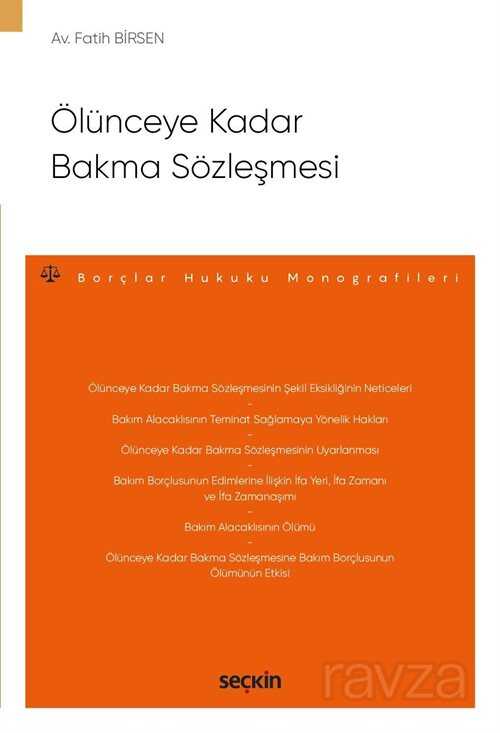 Ölünceye kadar bakma sözleşmesinin miras hukuku aile hukuku ve icra hukuku gibi diğer hukuk alanlarıyla ilişkisi bulunmaktadır. Çalışmada; ölünceye kadar bakma sözleşmesinin tanımı türleri unsurları ve hukuki niteliği sözleşmenin kurulması bakım alacaklısının ve bakım borçlusunun kimler olabileceği tarafların evli olmasının sözleşmeye etkisi tarafların küçük veya kısıtlı olması durumu sözleşmenin şekli ve kimler tarafından nasıl düzenleneceği sözleşmede irade bozuklukları ve muvazaa konusu sözleşmenin hükümleri bakım alacaklısının ve bakım borçlusunun hak ve borçları hakların nitelikleri edimlerin ifa zamanı ifa yeri ifa zamanaşımı ölünceye kadar bakma sözleşmesinin taraf iradeleriyle ya da kendiliğinden sona erme sebepleri bakım alacaklısının ve bakım borçlusunun ölümünün sözleşmeye etkisi tarafların sözleşmeden dönme şartları bakım alacaklısının fesih hakkı sözleşmenin bakım borçlusunun mirasçıları ile devam ettirilmesi bakım borçlusunun mallarının haczedilmesi bakım borçlusunun iflas etmesi sözleşmenin uyarlanması üçüncü şahısların sözleşme üzerindeki tenkis itiraz ve iptal hakları ile sonuçları ayrıntılı olarak incelenmiştir.