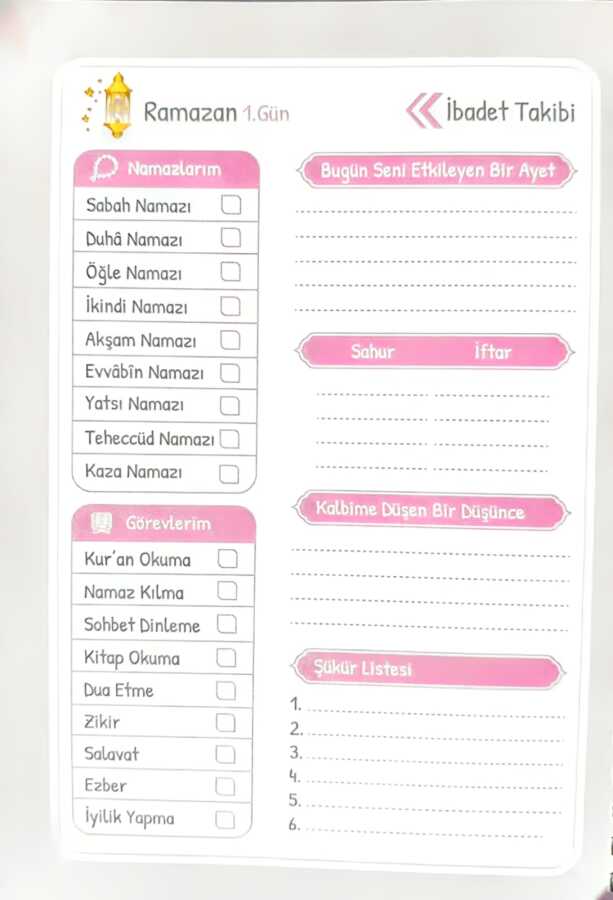 Gelince Haber VerRamazan Ajandası, Ramazan ayını daha bilinçli, düzenli ve huzurlu geçirmek isteyenler için özenle tasarlanmış özel bir ibadet planlayıcısıdır.30 günlük iftar programı çizelgesi sayesinde sahur ve iftar hazırlıklarınızı planlayabilir, günlerinizi daha verimli organize edebilirsiniz.4 haftalık hedef ve plan bölümü ile Ramazan boyunca ulaşmak istediğiniz manevi hedefleri belirleyebilir ve adım adım takip edebilirsiniz.Ramazan başlamadan önce niyetlerinizi ve beklentilerinizi yazabileceğiniz özel hazırlık sayfaları ile bu mübarek aya güçlü bir başlangıç yapabilirsiniz.Ajanda içerisinde Ramazan ve oruç hakkında hadisler, tevbe ve dualar ile özel gecelerin anlam ve faziletlerine dair açıklamalar yer almaktadır.Oruç, hatim ve teravih çizelgeleri sayesinde ibadet takibini kolay ve motive edici bir şekilde gerçekleştirebilirsiniz.1 günden 30. güne kadar hazırlanan günlük ibadet takip sayfalarında namaz ve virdler için işaretleme alanları bulunmaktadır.Her gün için özel olarak seçilmiş bir hadis, bir dua ve bir tavsiye ile Ramazan boyunca manevi motivasyonunuzu canlı tutabilirsiniz.Süresiz tasarımı sayesinde her yıl yeniden kullanılabilir; uzun yıllar boyunca size eşlik eden kalıcı bir manevi rehber olur.Ramazan Ajandası, hem kendiniz hem de sevdikleriniz için anlamlı ve faydalı bir Ramazan hediyesi olmaya adaydır.