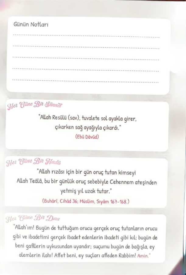 Gelince Haber VerRamazan Ajandası, Ramazan ayını daha bilinçli, düzenli ve huzurlu geçirmek isteyenler için özenle tasarlanmış özel bir ibadet planlayıcısıdır.30 günlük iftar programı çizelgesi sayesinde sahur ve iftar hazırlıklarınızı planlayabilir, günlerinizi daha verimli organize edebilirsiniz.4 haftalık hedef ve plan bölümü ile Ramazan boyunca ulaşmak istediğiniz manevi hedefleri belirleyebilir ve adım adım takip edebilirsiniz.Ramazan başlamadan önce niyetlerinizi ve beklentilerinizi yazabileceğiniz özel hazırlık sayfaları ile bu mübarek aya güçlü bir başlangıç yapabilirsiniz.Ajanda içerisinde Ramazan ve oruç hakkında hadisler, tevbe ve dualar ile özel gecelerin anlam ve faziletlerine dair açıklamalar yer almaktadır.Oruç, hatim ve teravih çizelgeleri sayesinde ibadet takibini kolay ve motive edici bir şekilde gerçekleştirebilirsiniz.1 günden 30. güne kadar hazırlanan günlük ibadet takip sayfalarında namaz ve virdler için işaretleme alanları bulunmaktadır.Her gün için özel olarak seçilmiş bir hadis, bir dua ve bir tavsiye ile Ramazan boyunca manevi motivasyonunuzu canlı tutabilirsiniz.Süresiz tasarımı sayesinde her yıl yeniden kullanılabilir; uzun yıllar boyunca size eşlik eden kalıcı bir manevi rehber olur.Ramazan Ajandası, hem kendiniz hem de sevdikleriniz için anlamlı ve faydalı bir Ramazan hediyesi olmaya adaydır.