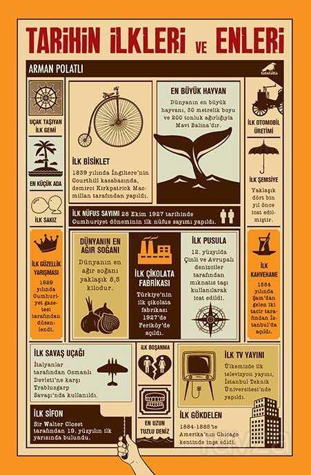 Dünyadan ve Türkiye tarihinden şaşırtıcı eğlenceli ilkler ve enler bir arada.Dünyanın ilk şarkısı ve en uzun çölü tüm zamanların en eski aşk mektubu ve uzaya çıkan ilk cesur kadın çatal-kaşık-bıçak üçlüsünün sahneye ilk çıkışı ve ilk aşırı hız cezası... Gündelik hayatımızda alışkanlıklarımızın içinde sıradanlaşan kuralların alet edevatın ve hatta davranışların atalarına bakıyoruz. Onlarla tanışıp en büyük nehirlerden en yakın gök cisimlerine gidiyoruz.