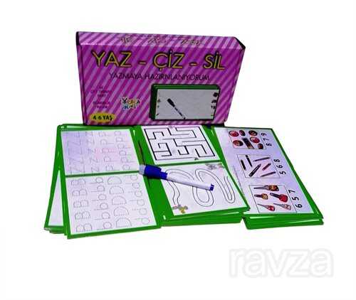 24 kart, 48 çalışma sayfası ve silinebilir kalemden oluşan bir set. Çocuk, silinebilir özelliği olan mürekkepli kalemle aynı çizgi veya harfin üzerinden defalarca geçebilir. Böylece hem hatalarını kolayca düzelterek kontrol altına alabilir hem de keyifle el- kas becerilerini geliştirir. Kartlar, kolay çizgilerden zor çizgilere, ilk harflerden son harflere doğru bir sıra izlemektedir.